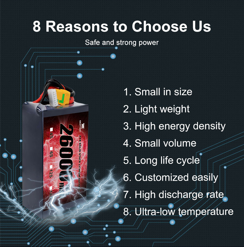 এই সলিড-স্টেট ব্যাটারিটি আপনার ড্রোন অভিজ্ঞতার বিপ্লব করার জন্য ডিজাইন করা হয়েছে। এর উচ্চ শক্তি ঘনত্বের সাথে, আপনি বর্ধিত ফ্লাইটের সময় এবং অতুলনীয় চালচলন অর্জন করতে পারেন। আপনি শখ বা শিল্প নেতা হোন না কেন, আমাদের 16000 এমএএইচ ব্যাটারি আপনার বায়বীয় অ্যাডভেঞ্চারের জন্য উপযুক্ত সহচর।