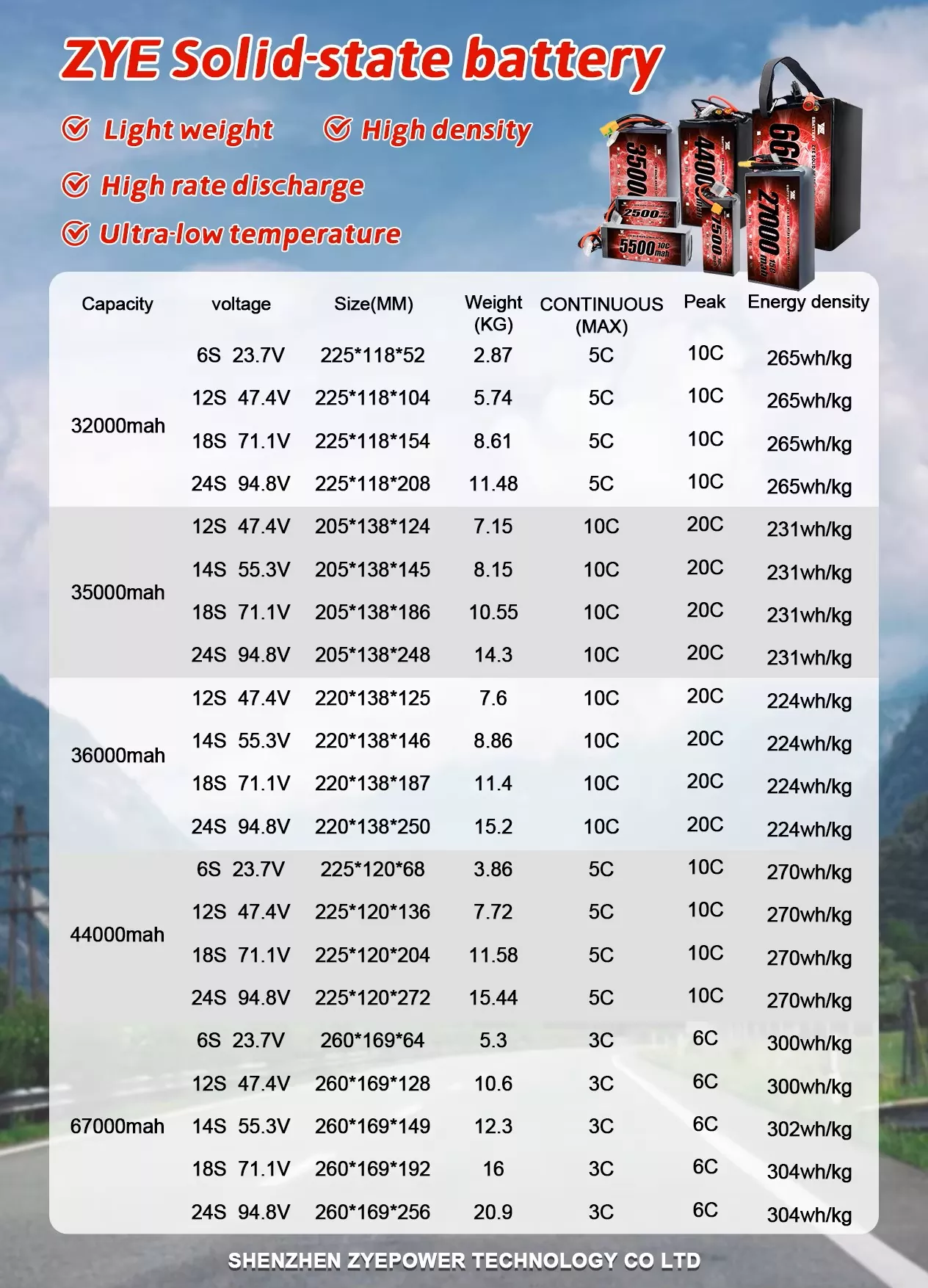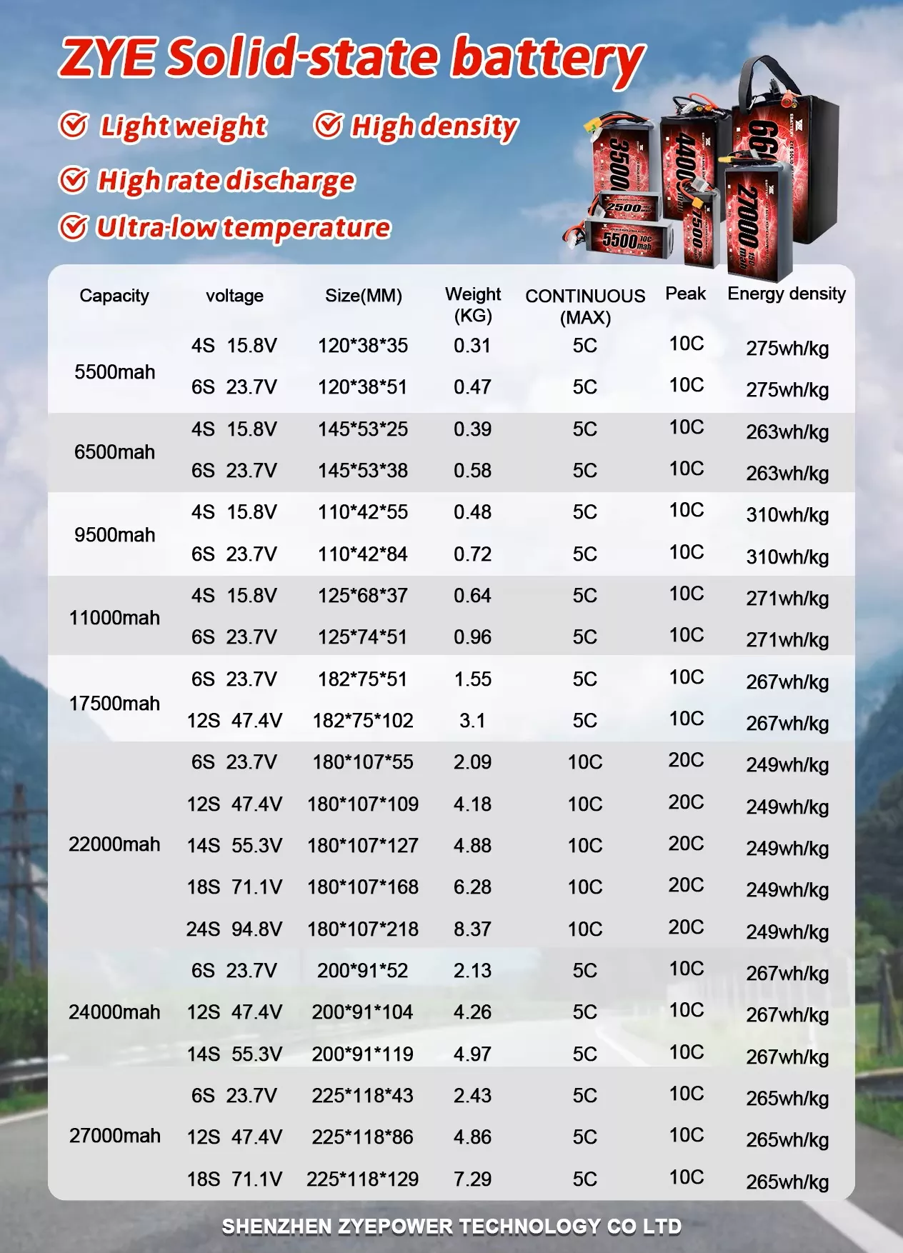 জাই হাই এনার্জি ডেনসিটি সলিড স্টেট ব্যাটারি পেশাদার প্রস্তুতকারক হিসাবে জাই দ্বারা উত্পাদিত উচ্চ স্থায়িত্বের বৈশিষ্ট্য রয়েছে। উচ্চ পারফরম্যান্স ড্রোন ব্যাটারি খুঁজছেন? জাইব্যাটারি কাস্টম সলিড-স্টেট এবং 24s অবধি লিপো প্যাকগুলি সরবরাহ করে। কৃষি, বিতরণ এবং ম্যাপিং ইউএভিগুলির জন্য উপযুক্ত।
